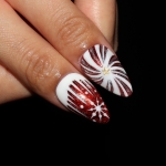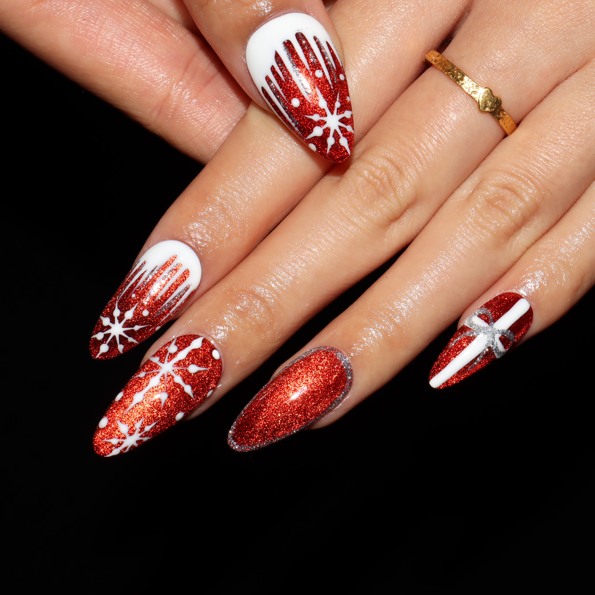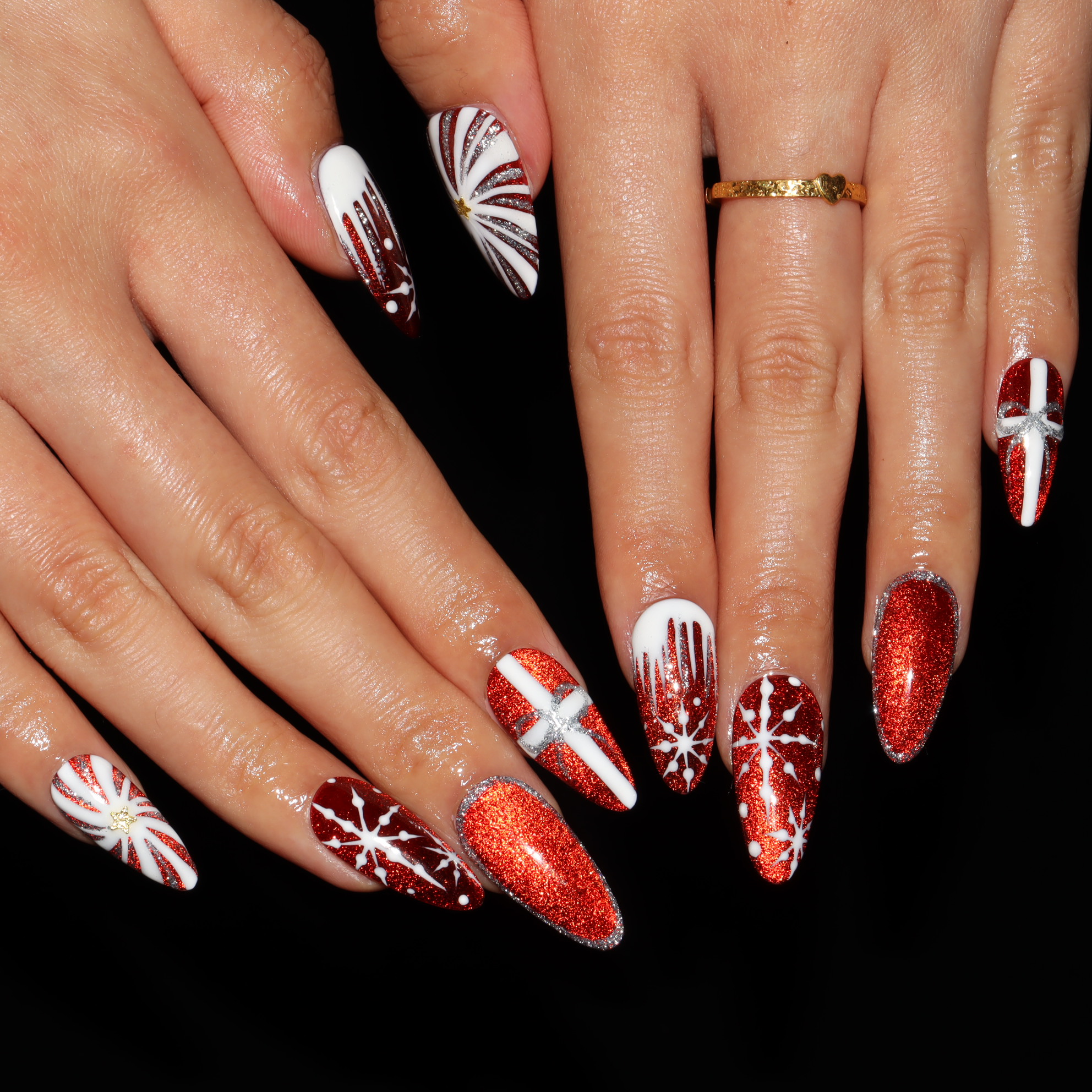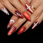 Using a deep, shimmering cat-eye base, these nails seem to glow from within, creating a mesmerizing backdrop for intricate, hand-painted details. It’s a look that is sweet, spicy, and undeniably festive.